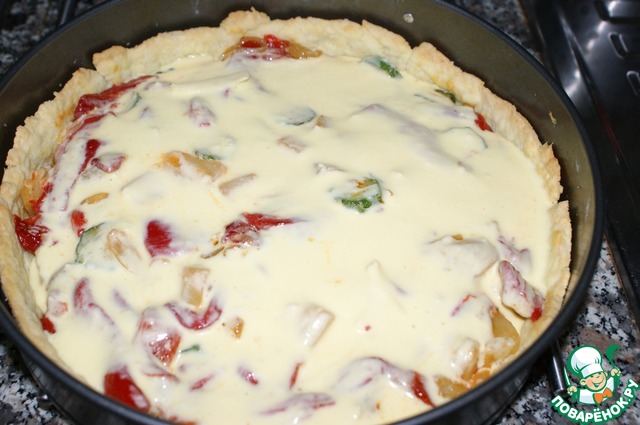 9. Заливаем яичной заливкой и посыпаем тертым сыром. Отправляем пирог в духовку еще на 40 мин..