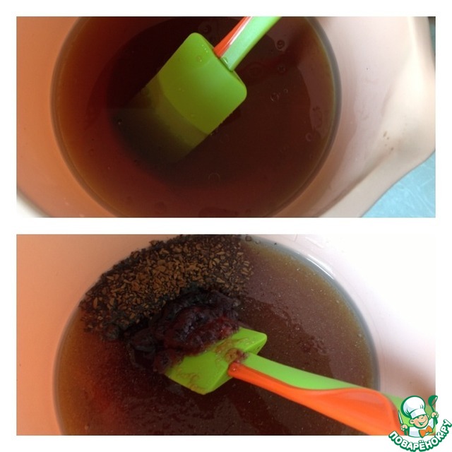 Добавить масло и мед, размешать до полного растворения меда. Далее добавить кофе, джем и размешать
