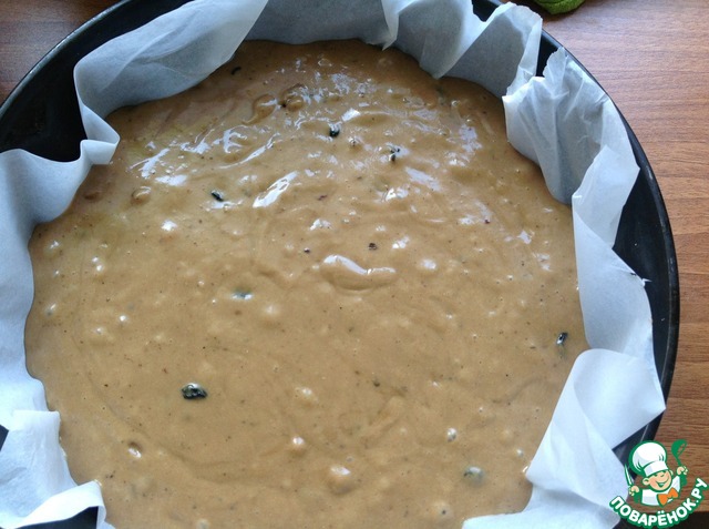 В форму выстеленную пекарской бумагой выкладываем тесто и отправляем в духовку на 40 мин при 180 гр