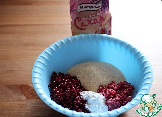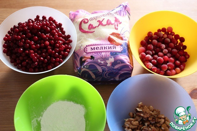 Для начинки нам понадобится: 0,5л банки мочёной брусники без сока, клюква, орех грецкий, сахар Мистраль "Мелкий" и немного картофельного крахмала.