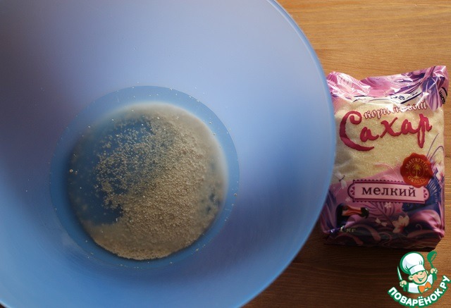 В тёплой воде растворить сахар и соль, добавить дрожжи и оставить минут на 10-15.