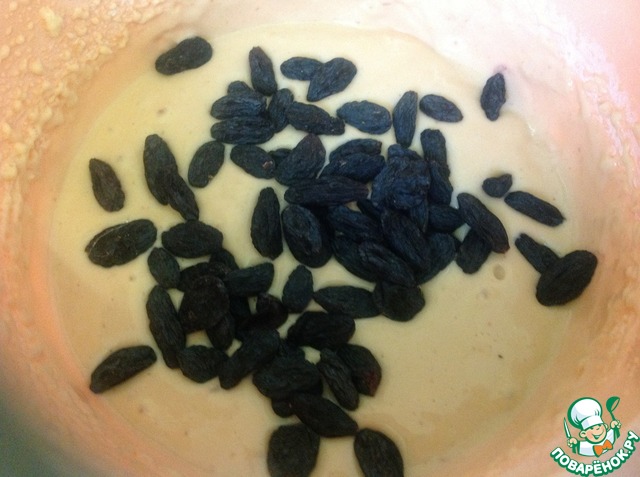 Добавить изюм и аккуратно перемешать. Я предварительно изюм не замачивала. Тесто выложить в форму, у меня силиконовая поэтому маслом ее не смазывала. Отправить пирог в духовку на 40 мин при 180 гр