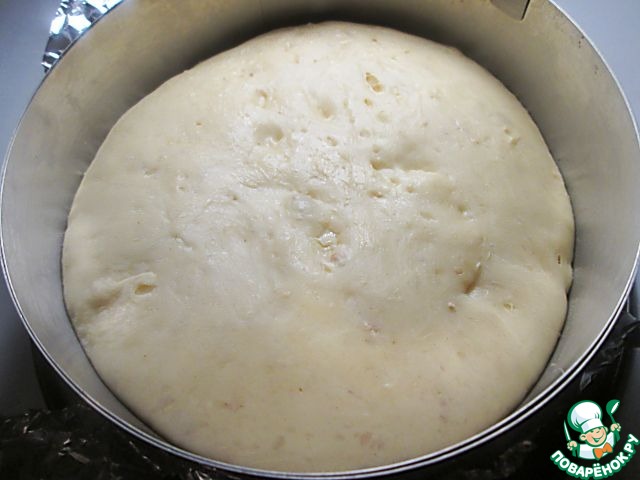 Выложить тесто в форму диаметром 17 см ровным слоем, поставить в теплое место на 45-60 минут. Тесто должно увеличиться в объеме в 2 раза.