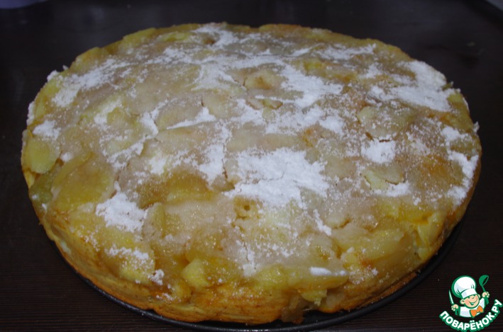 Перевернуть. Из остатков сахара сделать пудру или взять готовую, обильно посыпать ею пирог и дать полностью остыть. Сахарная пудра подтает и образует легкую приятную корочку.