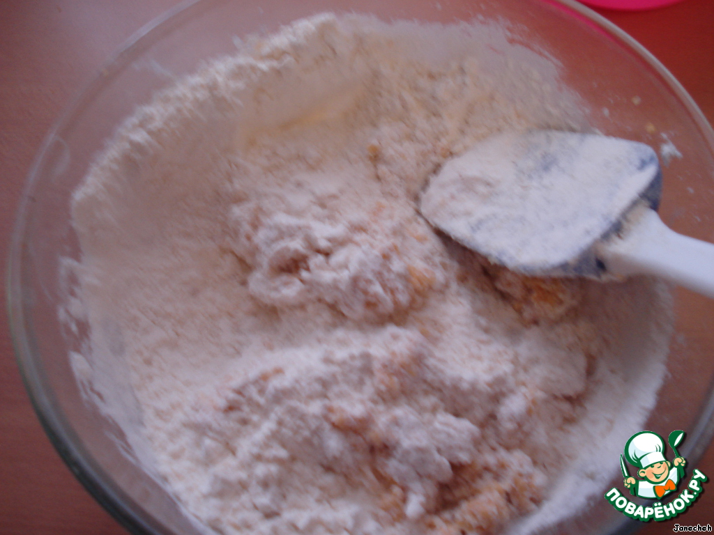 Муку перемешать с разрыхлителем и добавить в тесто в 2-3 приема, разбавляя по чуть-чуть молоком, если тесто станет слишком густым.