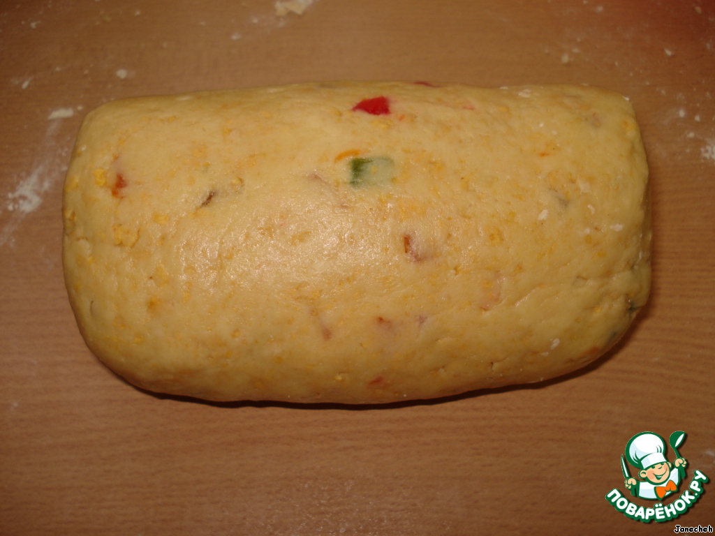 Всыпать цукаты, нарезанные на кусочки, и еще раз перемешать. Выложить тесто на посыпанный мукой стол и вымесить руками, сформировать кирпич и замотать в целлофановую пленку. Поместить в холодильник на 2-3 часа.