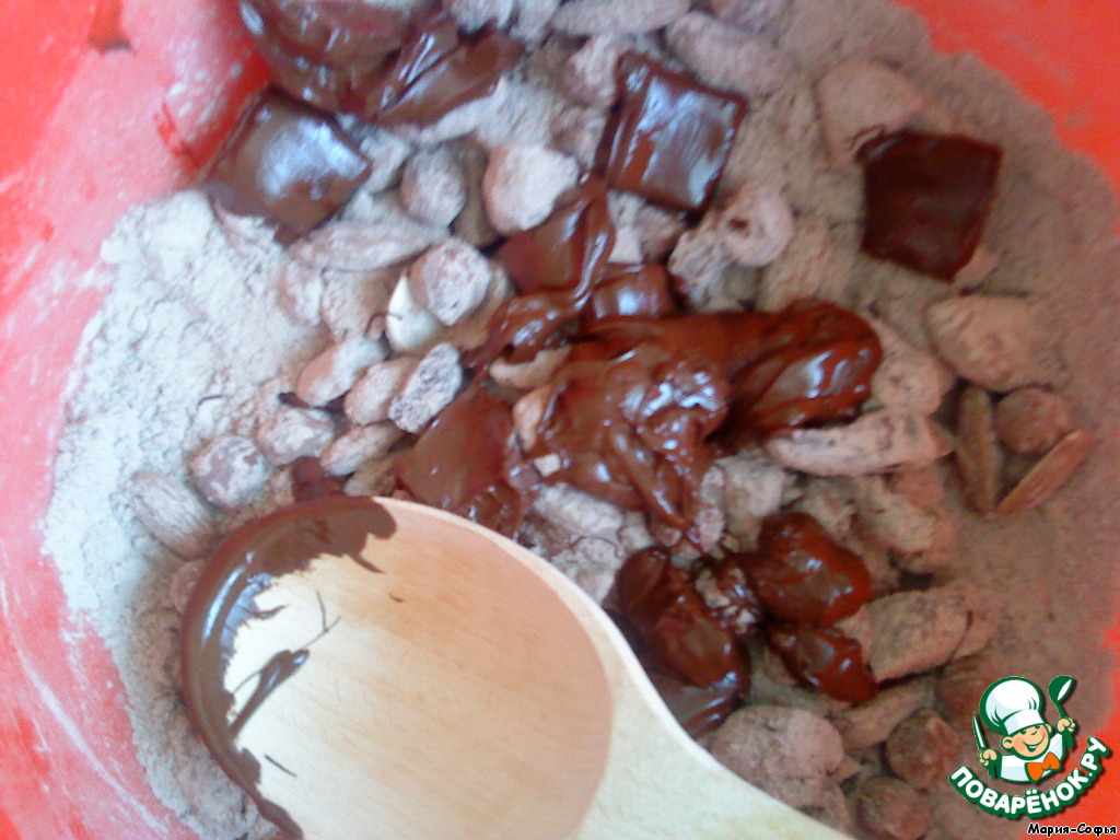 Растопленный шоколад добавить к муке и орехам.