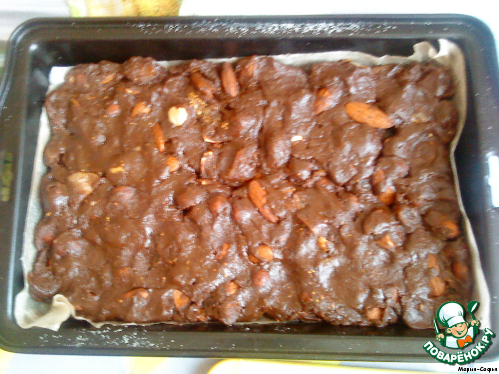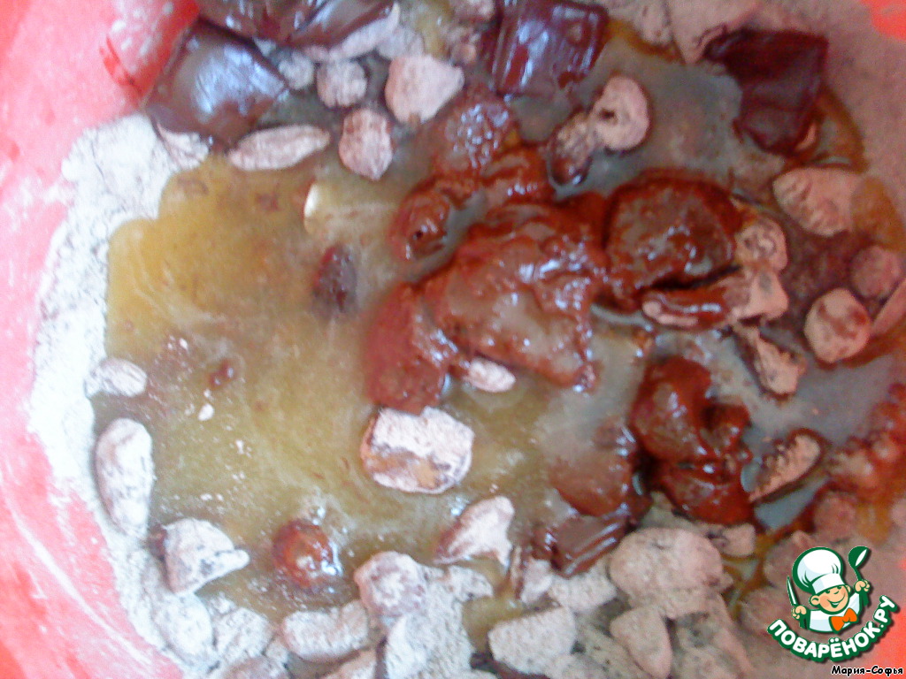 Растопленный мед и сахар добавить к муке, орехам и шоколаду.