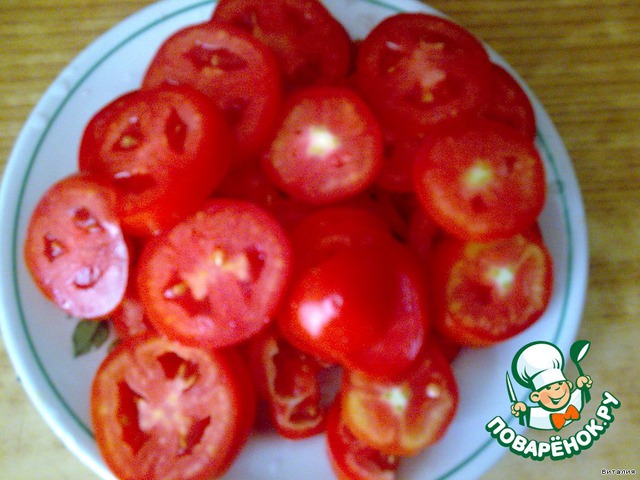 Сверху выложить кружочки помидоров и посыпать зеленью.