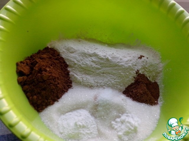 Смешиваем сухие ингредиенты:муку, сахар, корицу, ванильный сахар, какао-порошок, разрыхлитель и соду ( гасить не надо).