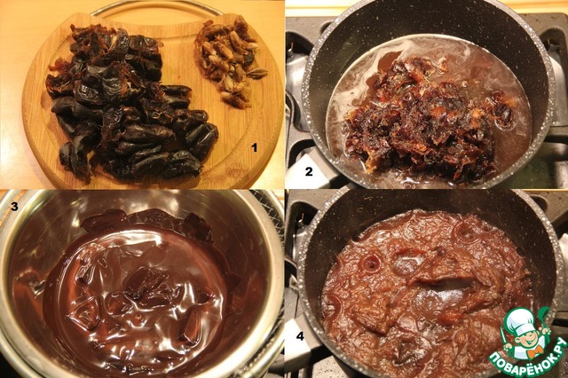 3. В это время распускаем шоколад на водяной бане или в микроволновке. 4. После того как финики закипят, размякнут и впитают почти всю воду, выключаем и разминаем при помощи вилки, но не блендера.