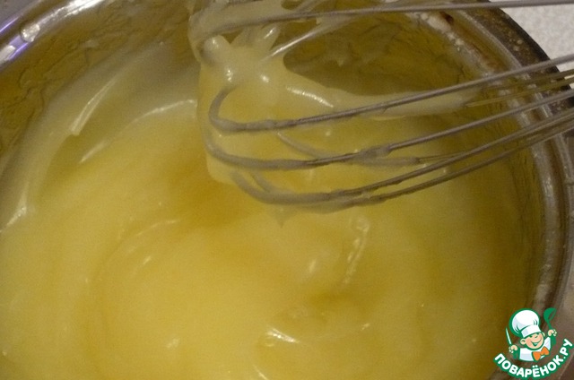 Сначала приготовим бисквит. Соединяем воду, масло, сахар. Подогревайте до растворения сахара, не доводя до кипения. Снимите с огня и полностью охладить. Смешать с мукой и разрыхлителем.