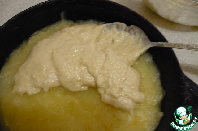 Пока остывает масляная смесь на бисквит, мы займемся ананасами. Слить весь сок, смешать с крахмалом. Добавить туда масло (на фото с ингредиентами маргарин, но мне не понравился привкус), сахар и воду. Довести до кипения и варите 3 мин. до загустения. Дать немного остыть.