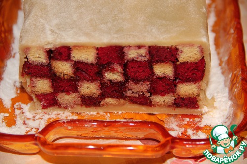 Кладем раскатанный марципан, на котором будем подавать пирог.