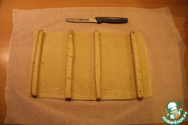 "4" Мажем полоски пирога со всех сторон вареньем и укладываем на марципане.