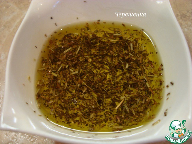 Смешать оливковое масло с травами. Если вы счастливый обладатель свежего тимьяна или розмарина, то, конечно, берите свежую травку, мелко нарезанную, аромат будет намного сильнее и ярче!