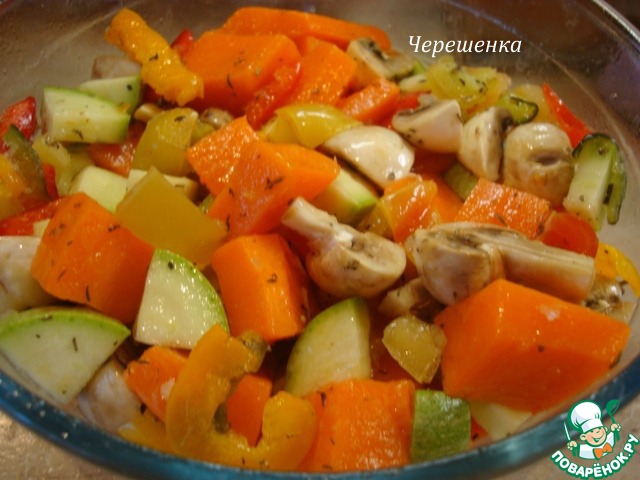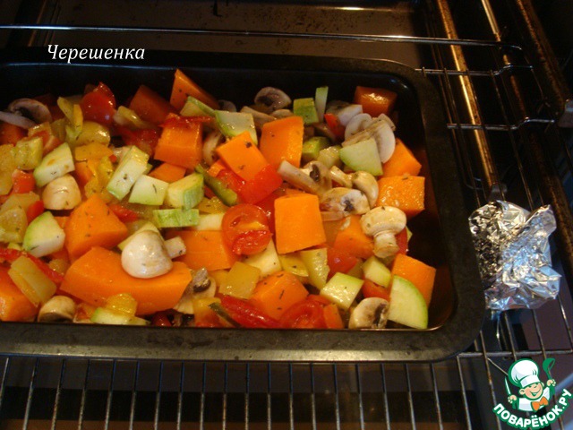 Овощи, грибы и чеснок запекать в заранее разогретой до 200 градусов духовке 20 минут…