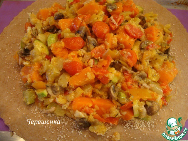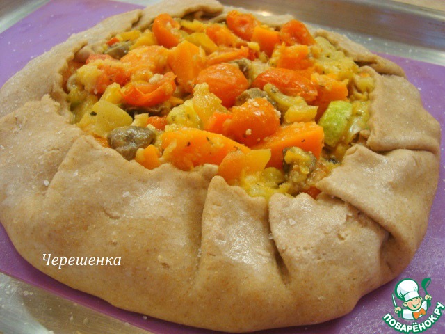 Т. к. начинка очень сочная, то во избегания «протечки» середину круга присыпьте панировочными сухарями. Сверху выложите начинку, не доставая до краев 5-7см, и заверните галету по кругу…