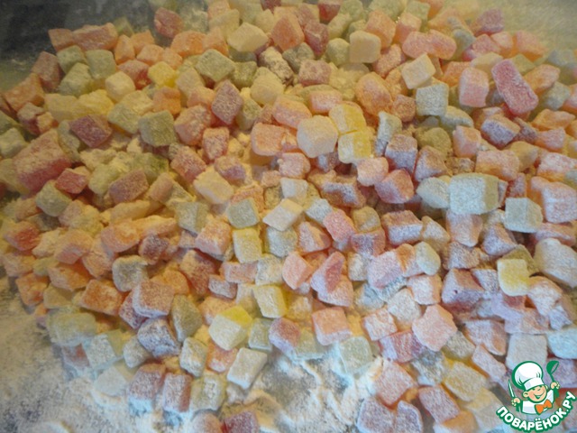 Тщательно обваливаем его в муке, чтобы разделить кусочки мармелада, и они в пироге не слиплись вместе.