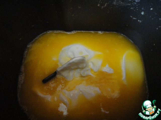 Обычно масло для выпечки в хлебопечи я режу маленькими кусочками, но т. к. тут нет яиц, и выходит мало жидких ингредиентов, то масло я растопила в микроволновой печке. Выливаем масло к сметане.