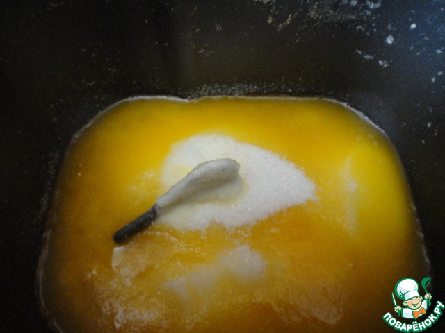 К сожалению в этом режиме моя хлебопечь не подает сигнала для загрузки добавок, поэтому я добавляю мармелад минут через 5 после начала замеса.