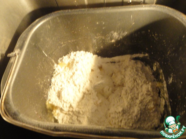 Ставим чашу в хлебопечь и включаем режим выпечки из бездрожжевого теста. У меня (Кенвуд) это режим "Пирожное".