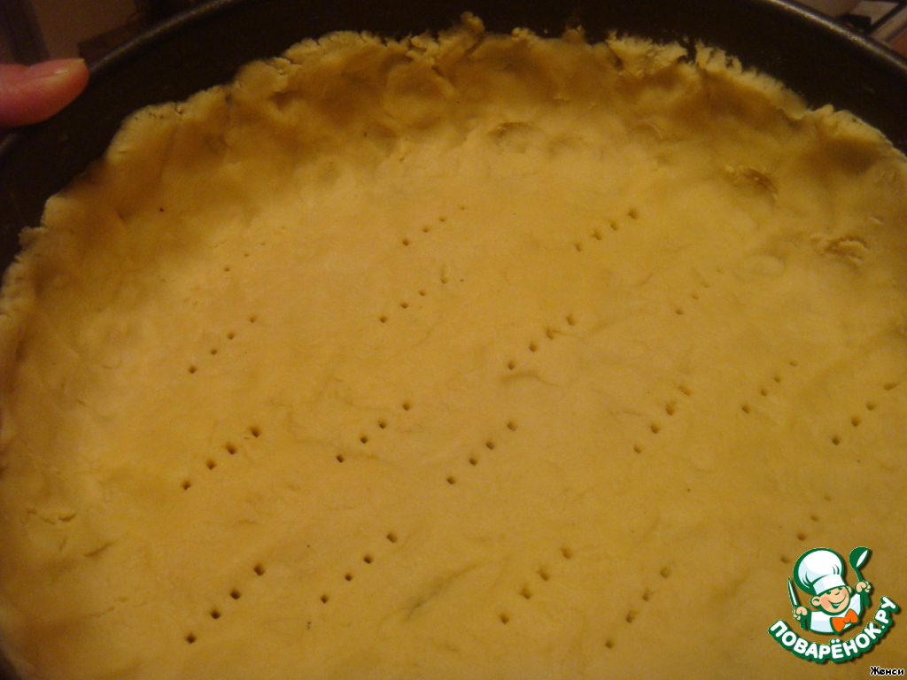 Приготовить тесто: смешать муку и нарубленный маргарин, соль, сахар в блендере до крошки, добавить воду и лимонный сок (мне по 1 ст.л. вполне хватило!). Тесто положить в форму, лучше разъемную (на дно, заходя на бортики по 3 см. примерно). Наколоть тесто вилкой и отправить в холод на 20 минут.