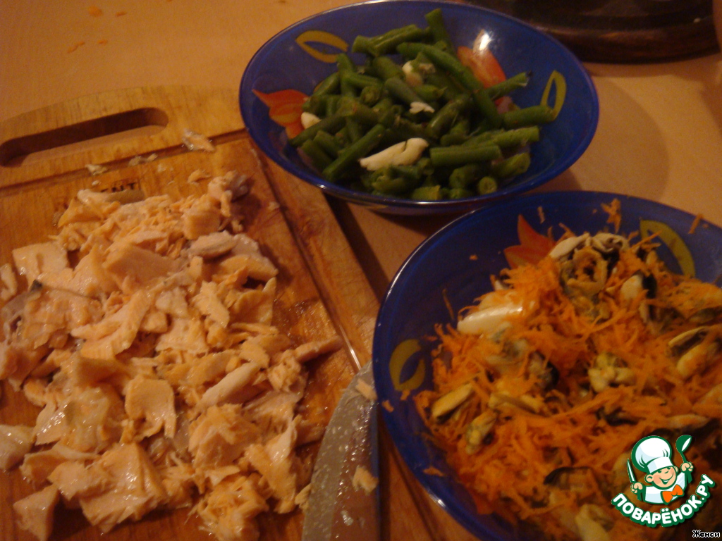 За это время подготовим начинку: отварить фасоль в кипящей соленой воде (2-3 минуты) с добавлением лимонной кислоты (для сохранения зеленого цвета). Вынуть из воды. Чеснок раздавить. Фасоль сбрызнуть лимонным соком, посыпать перцем и положить один раздавленный зубчик чеснока. Все перемешать и отставить в сторону настаиваться. Мидии и семгу отварить в той же воде (минут 5). Выложить мидии отдельно. Смешать с морковкой (натертой на мелкой терке) и вторым раздавленным чесноком. Отставить в сторону настаиваться.