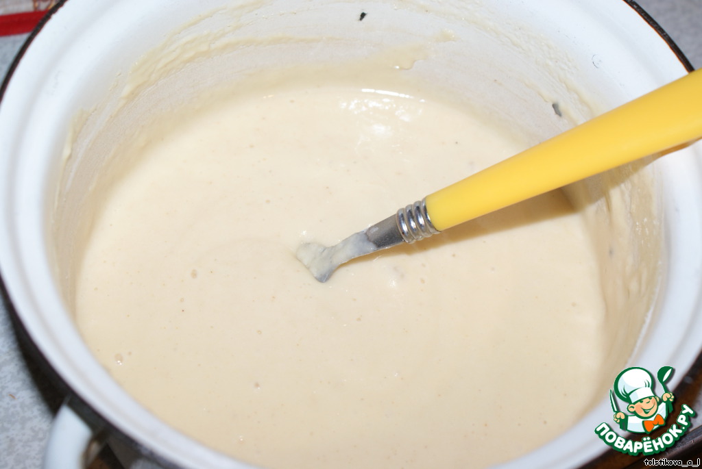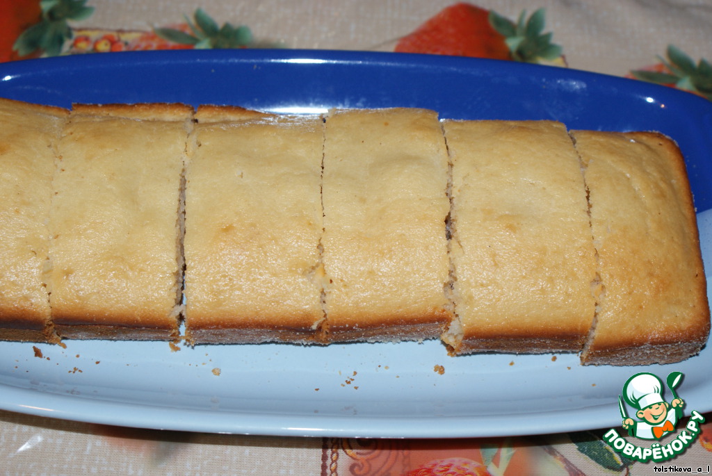 Готовый пирог немного остудить, достать из формы на блюдо. Можно, конечно, начинать есть и в таком виде, но я пошла дальше... Разрезала пирог на части толщиной, примерно, 3 см. Каждую часть разрезала пополам.