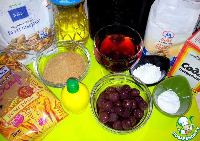 Ингредиенты - мука, компот вишнёвый, коричневый сахар "Мистраль", сода, масло подсолнечное, кислота лимонная, сахарная пудра.