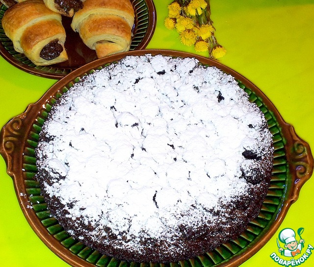 Пирог готов и похож он на шоколадный, потому что сироп тёмного цвета от спелой вишни и ложечки тёмного сахара.