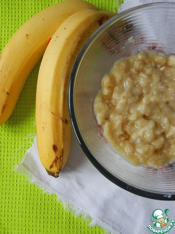 Бананы очищаем от кожуры и разминаем вилкой. В банановое пюре добавляем сахарно-маслянную смесь. Хорошенько перемешиваем