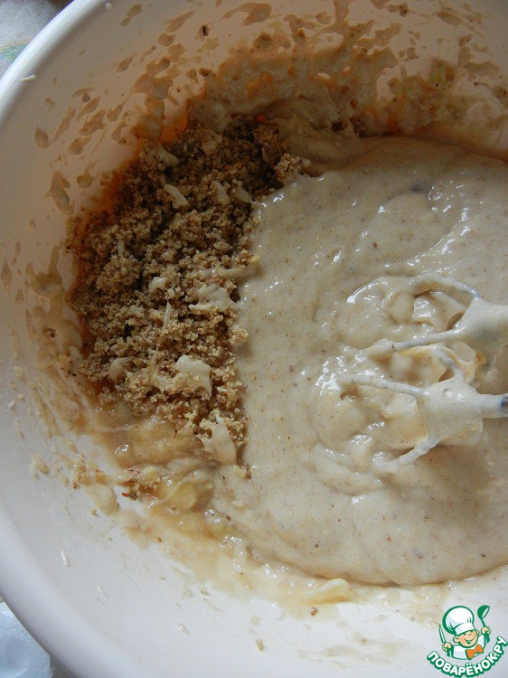 Орехи мелко порубить или перемолоть блендором. Затем смешиваем мучную смесь, орехи и банановую массу, хорошенько все перемешиваем до однородной массы. Я воспользовалась миксером. Тесто выкладываем в смазанную маслом форму и выпекаем в предварительно разогретой духовке до 180 градусов. Время выпечки 45-50 минут, мне понадобилось чуть больше. Так что ориентируйтесь на возможности своей "помощницы"