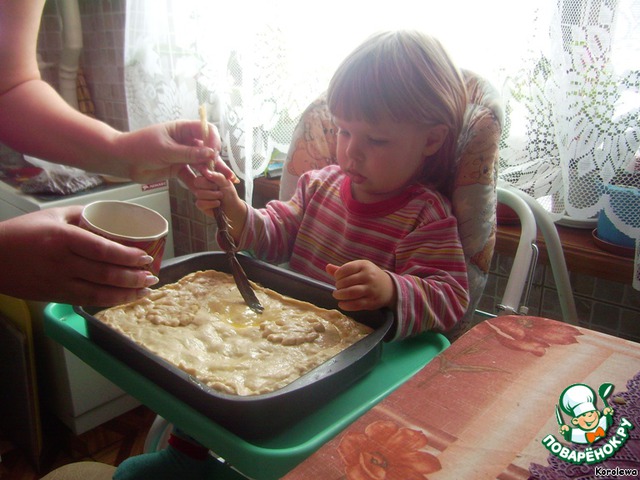 Смазываем пирог яйцом, взбитым с небольшим количеством сахара (для аппетитной корочки). Эту процедуру доверили доче. Она очень любит у нас творить! Выпекаем около 1 часа.