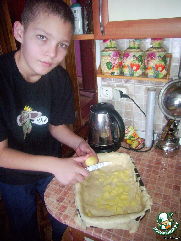 Сыну доверили нарезать мелкими кусочками картофель, который помещаем на дно противня, выстланного тестом. Потом солим картофель.