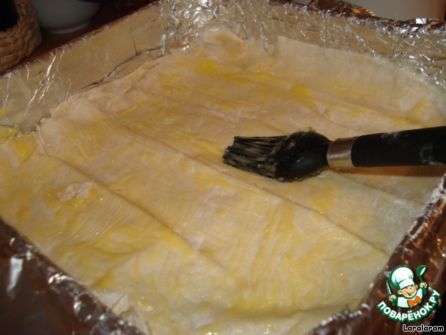 Нам нужно будет 4 листа размером 20х40. Каждый из них смазываем тонко маслом (каждый лист кладём на отдельное слегка увлажнённое полотенчико) и кладём в форму так, чтоб частью накрыть дно, а другая часть должна свисать сбоку (на фото видно). С каждого края должен свисать лист фило. Остальные листы нужны размером 20х20.