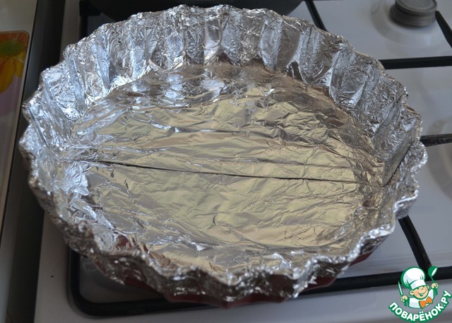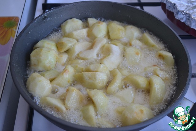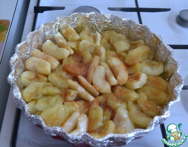 В идеале яблоки карамелизируются на сковороде в которой потом будет выпекаться пирог, но у меня нет сковороды со съемной ручкой, я выстелила форму фольгой ( честно – просто побоялась, что потом не отдеру эту карамель, напрасно боялась...)