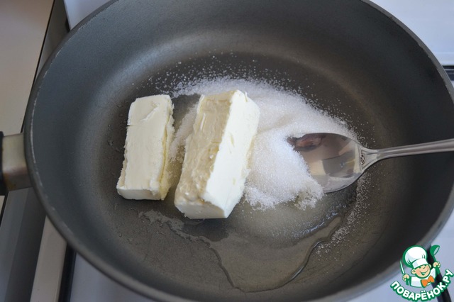 В толстостенную сковороду выложила масло, сахар и ликер ( в некоторых вариантах вода, в некоторых белое мускатное вино, – ликер это моя идея, хорошая, как оказалось)