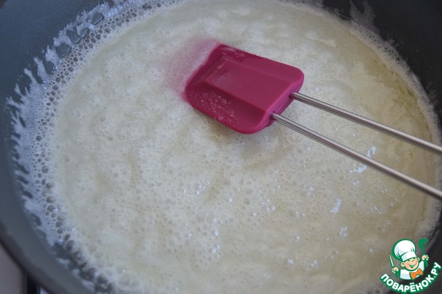 Прогреваем смесь до закипания, и обязательно дожидаемся, когда она начнет становиться такой золотистой. Я поспешила чуток.