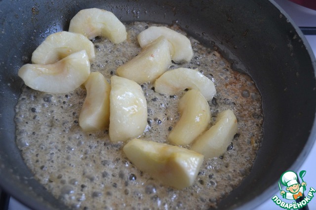 ЖАРИТЬ! Карамелизировать для меня слишком сложное слово, поняла я это тогда, когда яблочки начали становиться прозрачными и стремительно мягчеть. Мне показалось, что яблок мало и я дожарила еще два яблока, на этом фото отчетливо видна карамель в нужной кондиции.