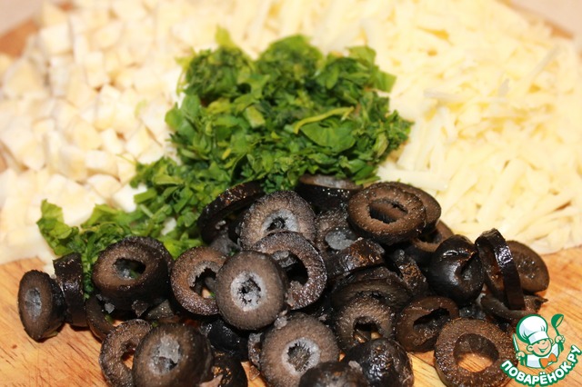 Сыр натереть на крупной тёрке, сельдерей нарезать мелким кубиком, зелень петрушки мелко нарезать, маслины нарезать кружочками.