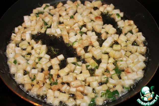 Сельдерей обжарить на небольшом количестве сливочного масла до зарумянивания.