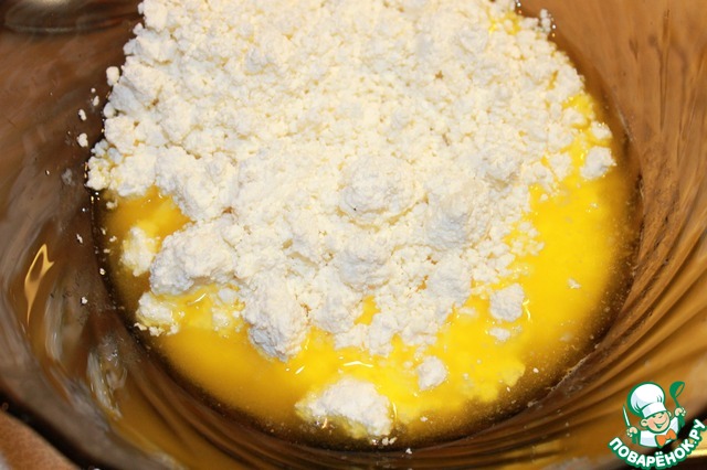 Оставшееся масло растопить, добавить в него творог и хорошо перемешать