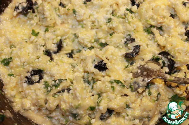 Добавить по одному яйца, перемешивая, сыр, зелень, сельдерей, маслины, муку и разрыхлитель. Тщательно перемешать. Должно получиться густое тесто. Заполнить тестом форму, разравнивая его ложкой. Выпекать 40 минут 180 *С
