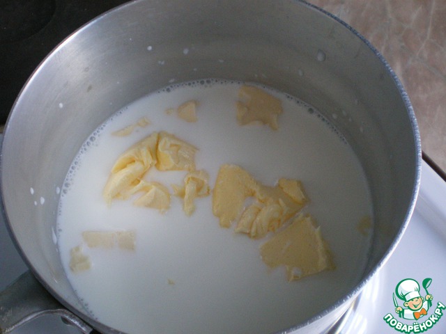 Молоко налить в кастрюлю, добавить соль и нарезанное кубиками масло, довести до кипения и готовить на слабом огне 2 минуты.