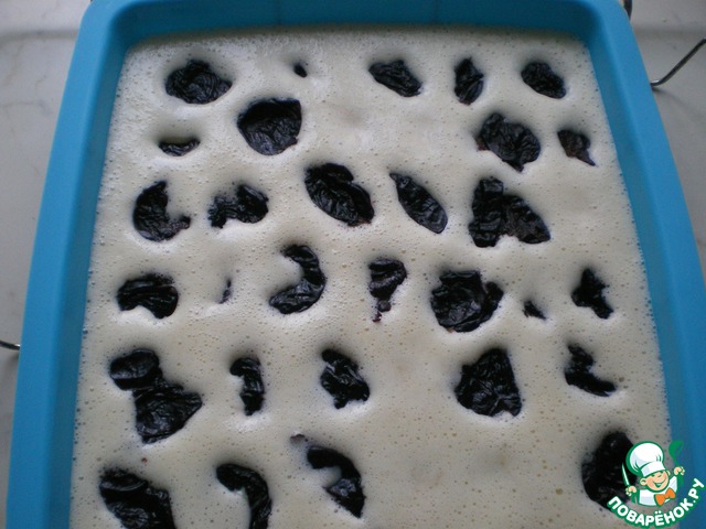Противень или прямоугольную форму смазать маслом. Вылить тесто, сверху распределить чернослив.