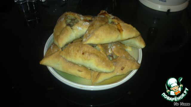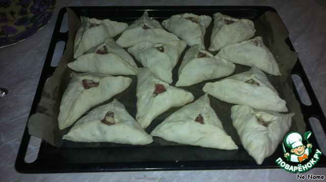 Сформировать треугольнички. Выложить на противень, смазанный маслом. Выпекаем при 180 градусах около часа.