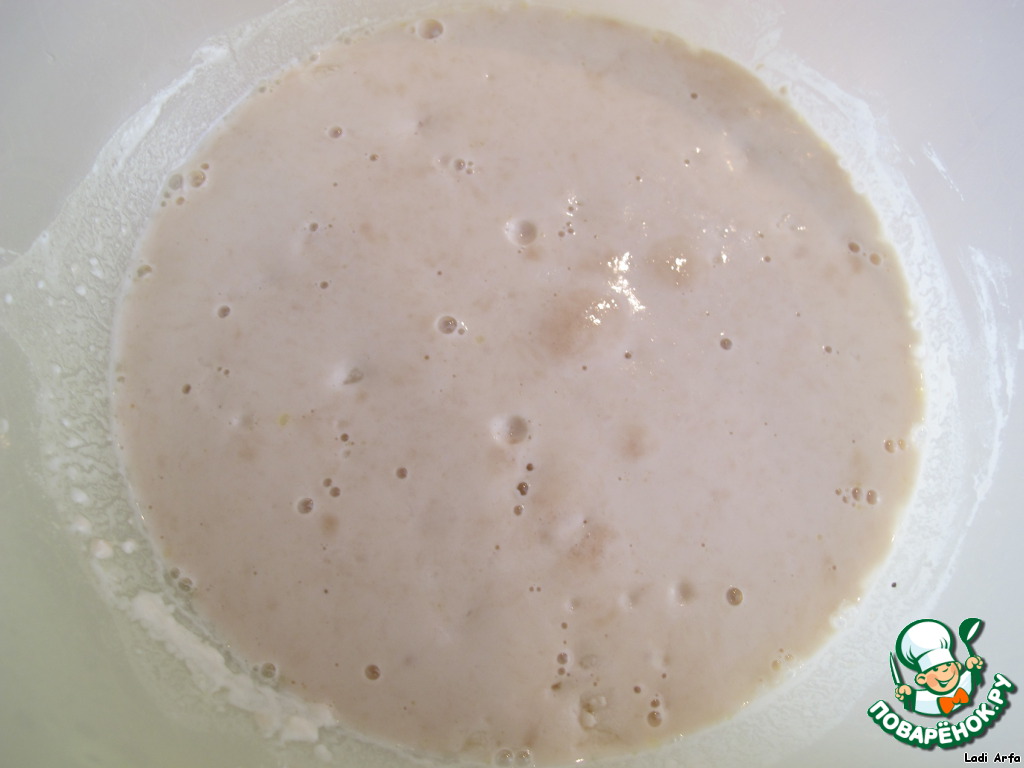 Дрожжи разведём стаканом тёплой воды (38*), добавим чайную ложку коричневого сахара, половину чайной ложки соли и столовую ложку муки. Прикроем и дадим "проснуться" дрожжам, минут 20-30.