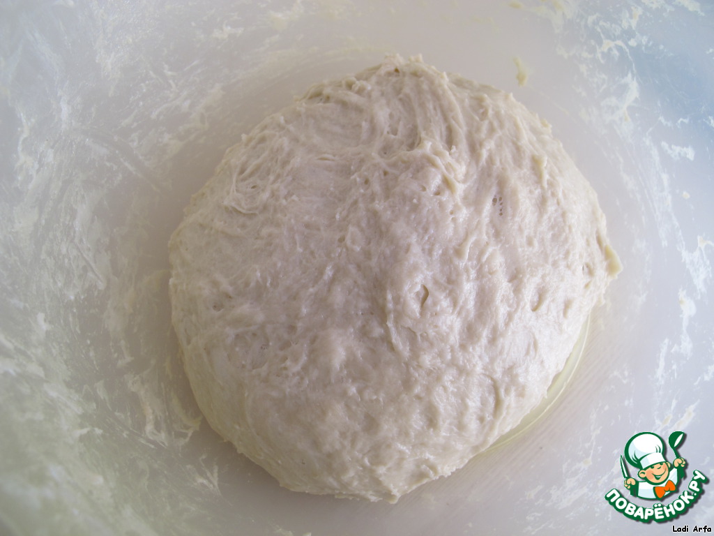 Вымешиваем тесто до состояния слегка липнущего к рукам, но собирающегося в колобок. Слегка смазываем маслом, закрываем и оставляем для подъёма в объёме в 2 раза.