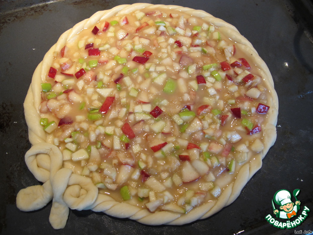 Выкладываем фруктовую начинку. Бортик смазываем желтком и украшаем.